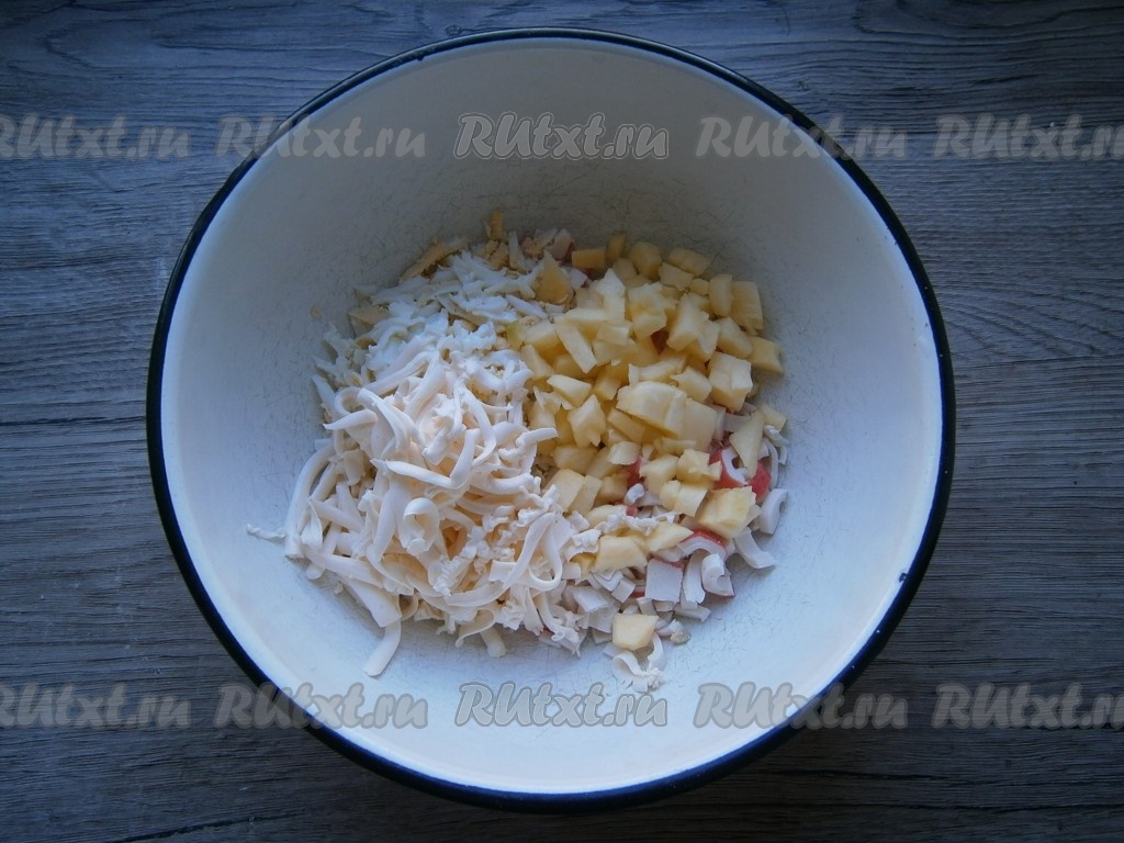 Яблоко, очищенное от кожуры и семян, нарезать маленькими кубиками. Плавленный сыр натереть на крупной терке. Добавить сыр и яблоко к яйцам и крабовым палочкам.