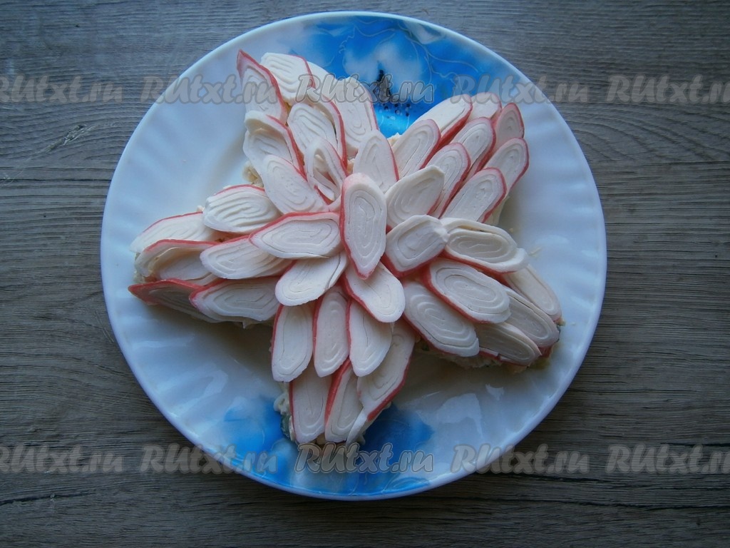 Крабовые палочки нарезать тонко наискосок, в результате получатся овальные кусочки. Верх салата украсить кусочками крабовых палочек.
