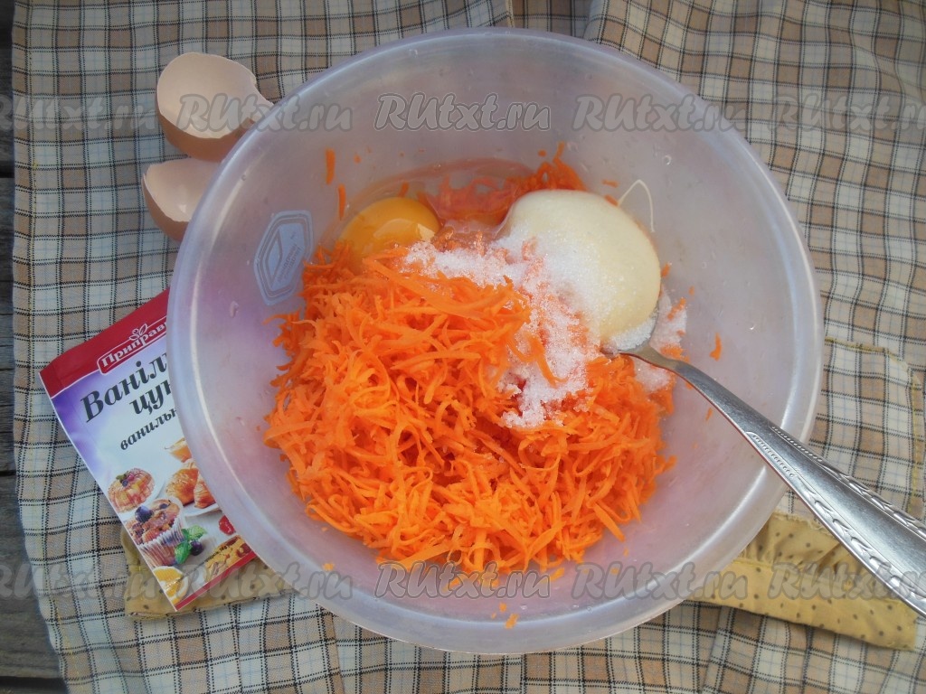 К натертой моркови добавьте щепотку соли, сахар, ванильный сахар, яйцо и сметану. Если будете готовить драники с морковью в соленом варианте, не добавляйте сахар и ванильный сахар.