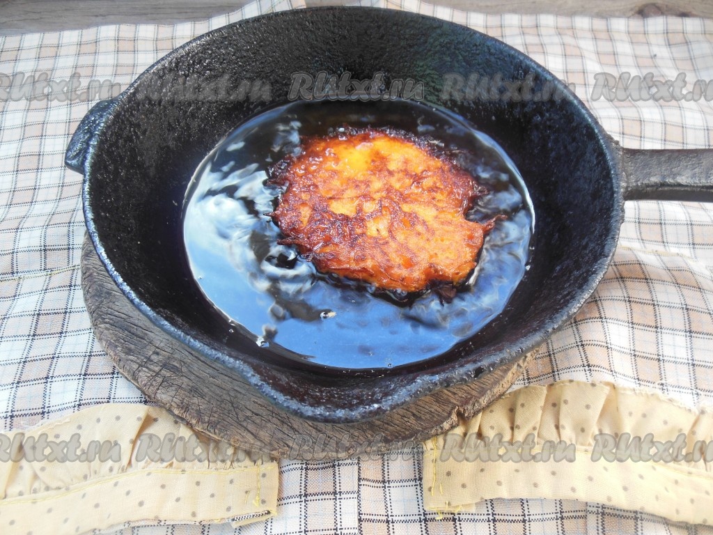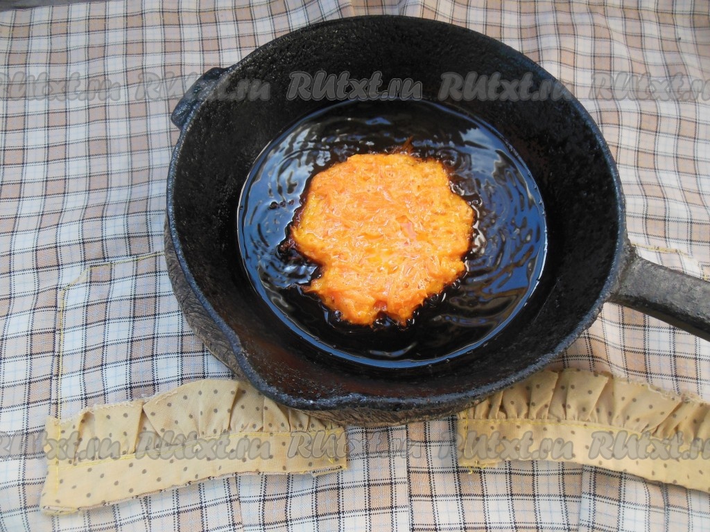 Сковороду хорошо разогрейте с растительным маслом. На сковороду выкладывайте по 1 столовой ложке морковного теста (на 1 драник), придавая округлую форму.