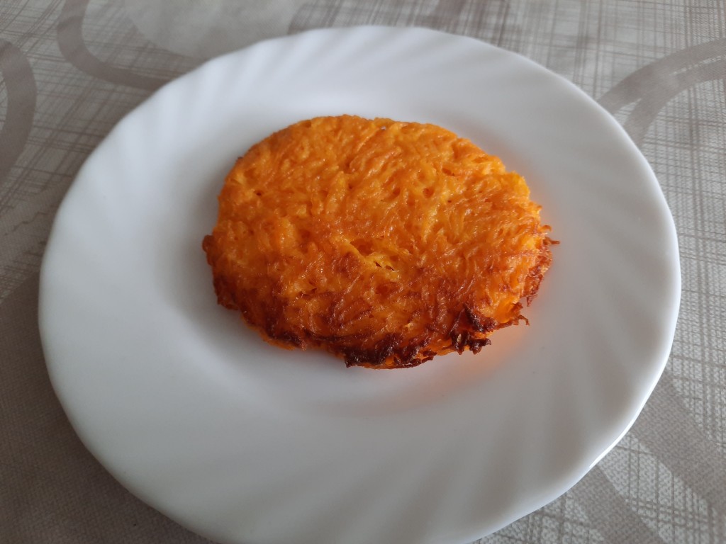 Жарьте морковные драники с двух сторон на медленном огне до аппетитной корочки (примерно, по 2-3 минуты с каждой стороны).