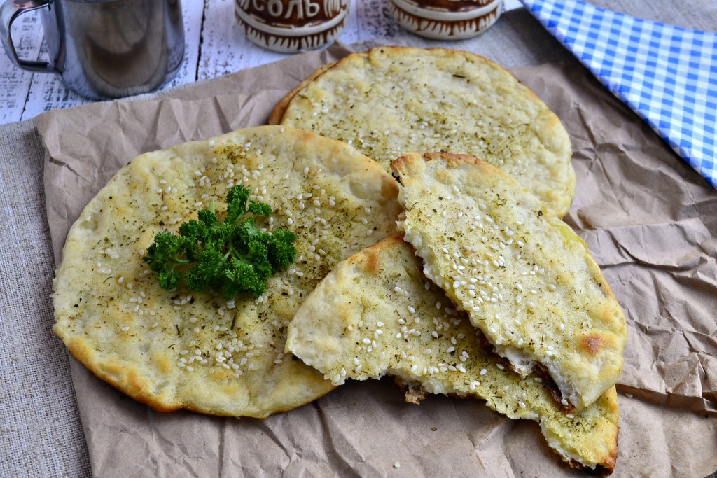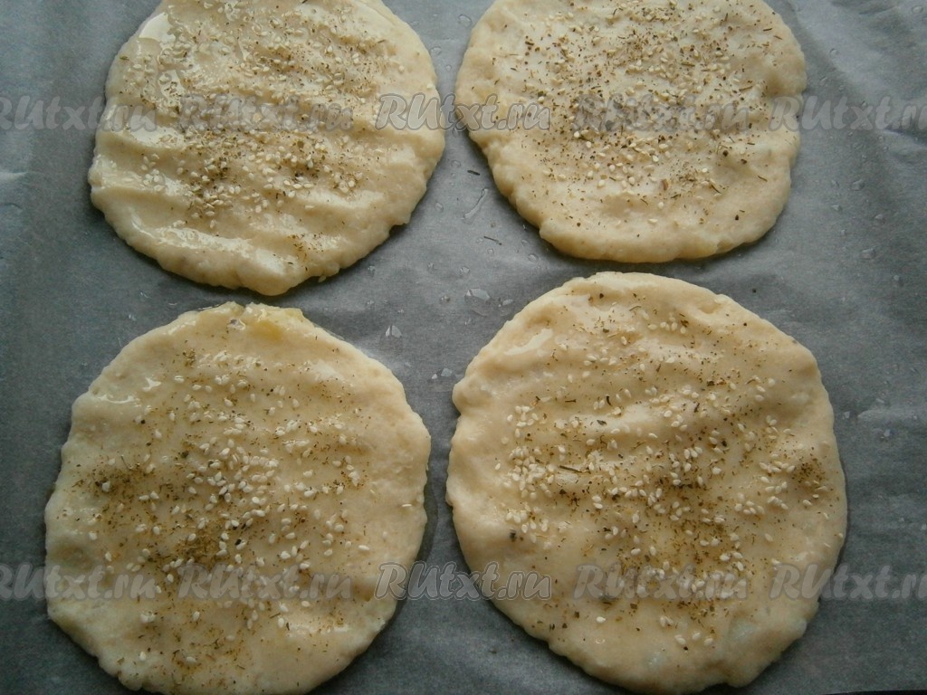 Противень застелить пергаментом, чуть смазать растительным маслом. Мокрыми руками сформировать нужной вам толщины и диаметра лепешки, разместить их на противне. Смазать лепешки немного сверху растительным маслом и посыпать любыми травами (хмели-сунели, прованскими, французскими и т.д.), а также кунжутом.