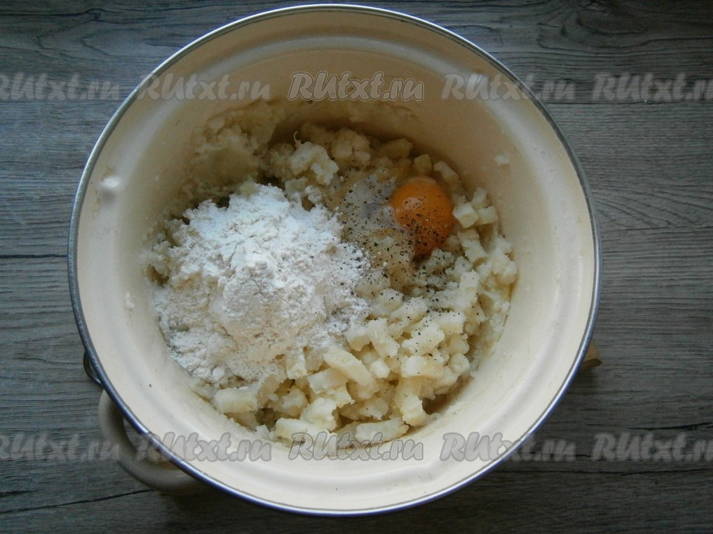 Добавить в толченый картофель сырое яйцо, а затем всыпать муку, черный молотый перец, если нужно - подсолить. Тщательно перемешать получившуюся массу.
