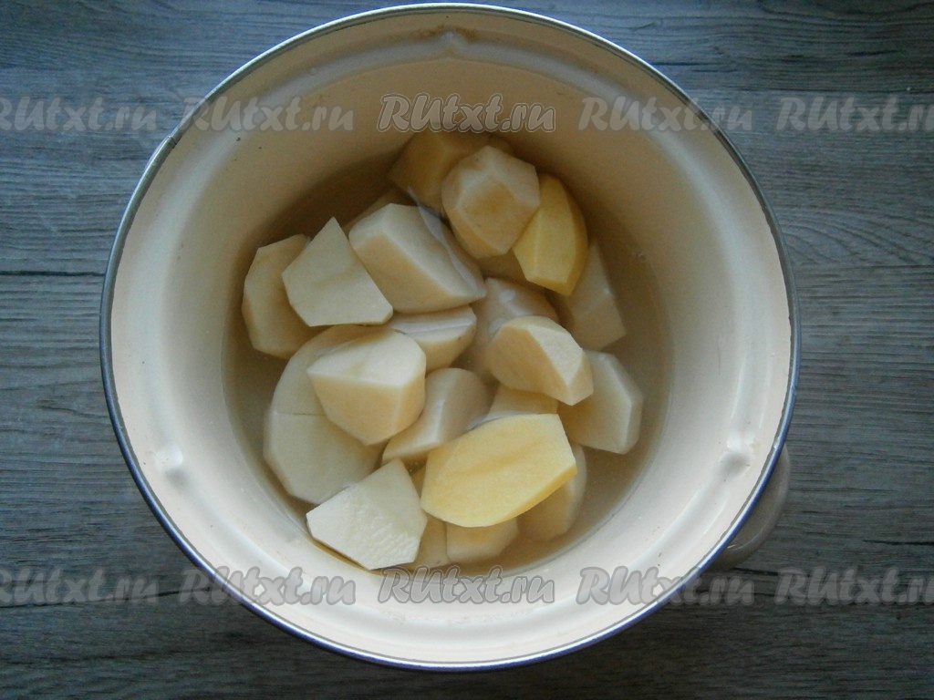 Отварить картофель, посолив по вкусу воду, до готовности (в течение 30-35 минут), после чего слить воду из кастрюли. Картошку растолочь и немного остудить.