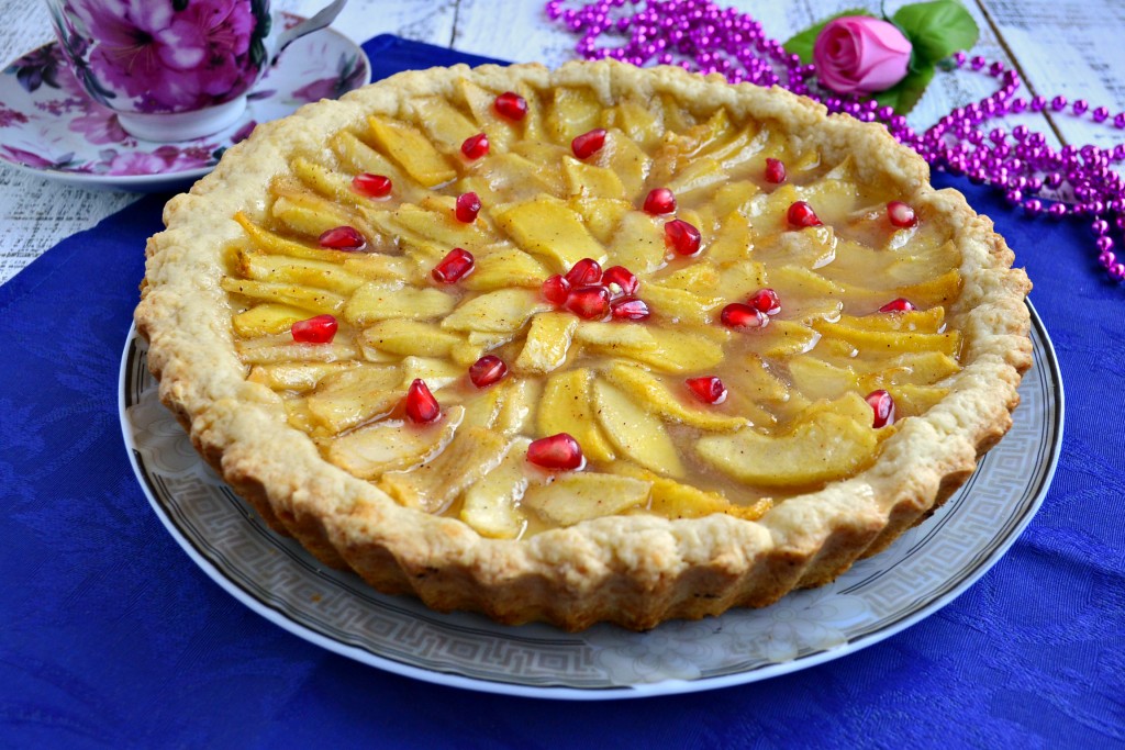 Остывший необычайно вкусный и ароматный яблочный пирог с карамельным соусом аккуратно извлечь из формы, нарезать и подать к чаю, украсив его, например, зёрнами граната.