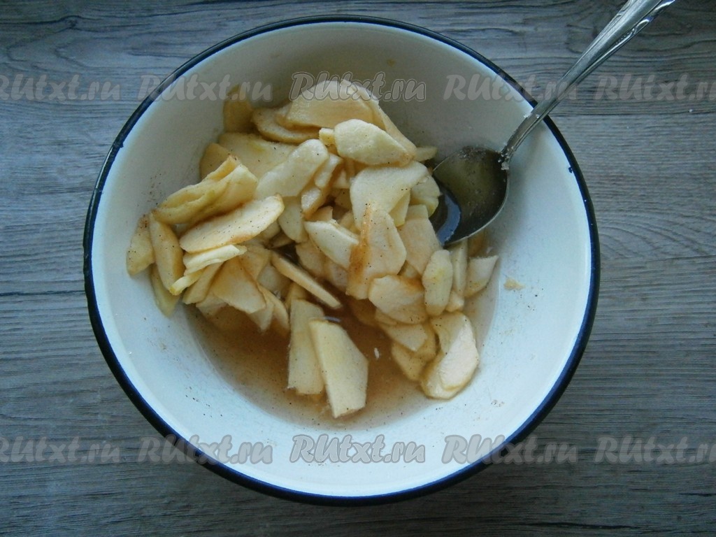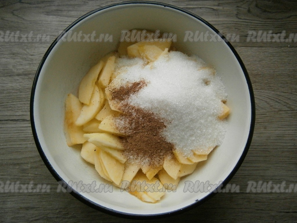 Яблоки очистить, разрезать пополам, удалить сердцевину. Нарезать яблоки тоненькими дольками в миску, сбрызнуть 2 чайными ложками лимонного сока. К нарезанным яблокам всыпать 150 грамм сахара, корицу и мускатный орех.
