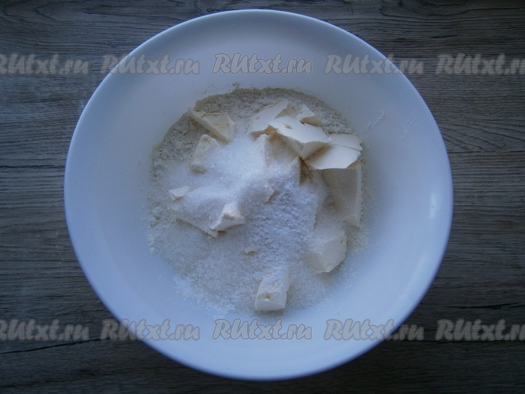 Для приготовления теста в миску просеять муку, добавить холодное сливочное масло (или маргарин), нарезанное на кусочки, всыпать сахар и разрыхлитель.