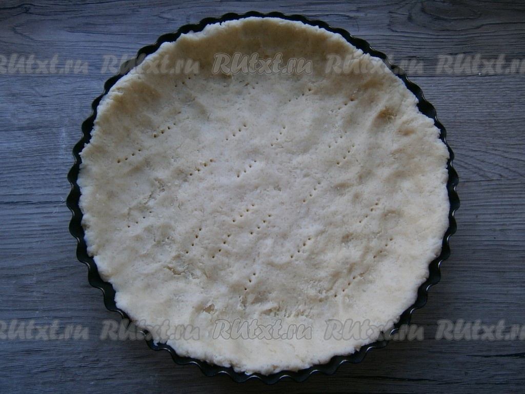 В круглую форму диаметром 22-23 см выложить тесто, растягивая его и формируя бортики, наколоть вилкой.