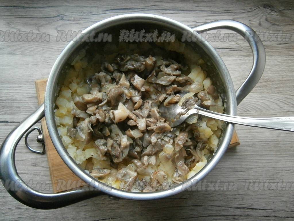 Обжарить грибы в течение 3-4 минут на сильном огне, помешивая. Лук очистить и нарезать на средние кусочки. К обжаренным грибам добавить нарезанный лук, посолить и поперчить по вкусу. Обжаривать грибы с луком, помешивая, на среднем огне около 10 минут. Жареные грибочки добавить в толченую картошку, перемешать, остудить и начинка для чебуреков готова.