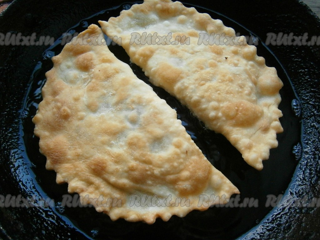 Жарить чебуреки, как обычно, в достаточном количестве растительного масла до румяности с двух сторон (примерно, по 2 минуты с каждой стороны) на среднем огне.