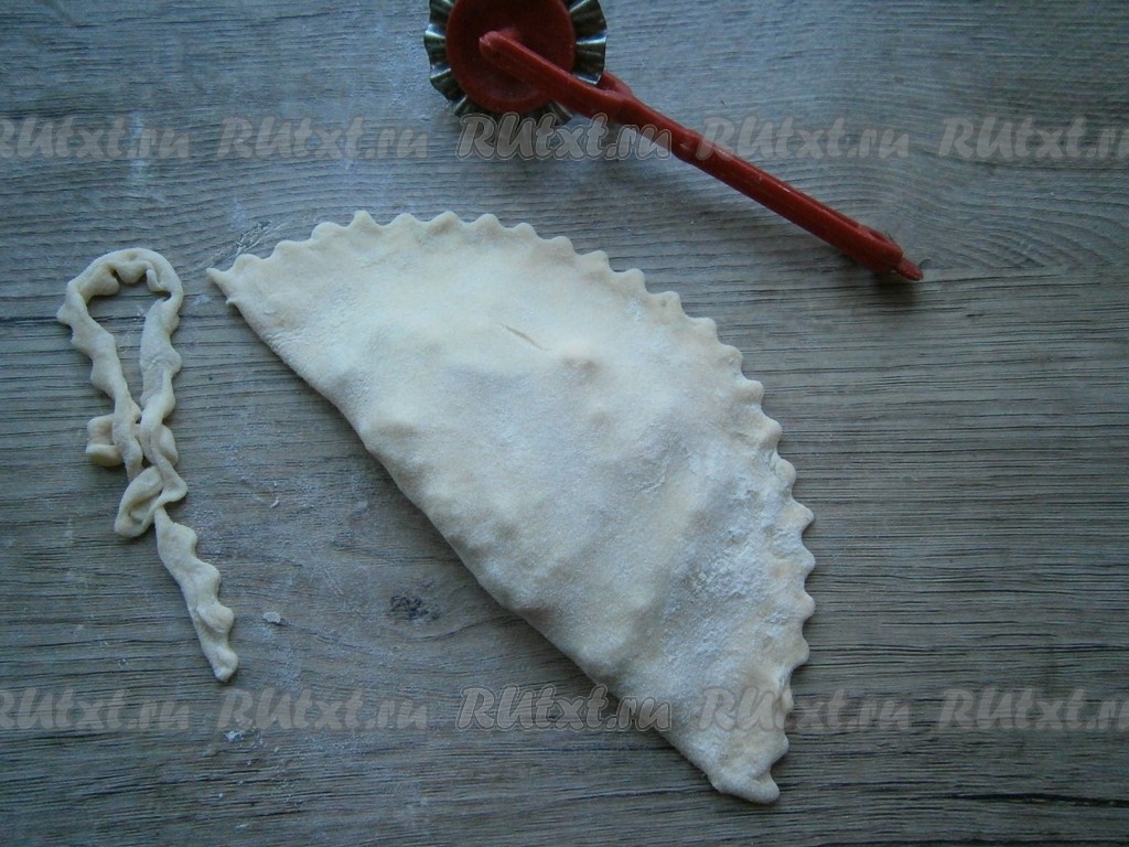 Из каждой лепешки с начинкой сформировать обычный чебурек, слепив края и обрезав их фигурным ножом.