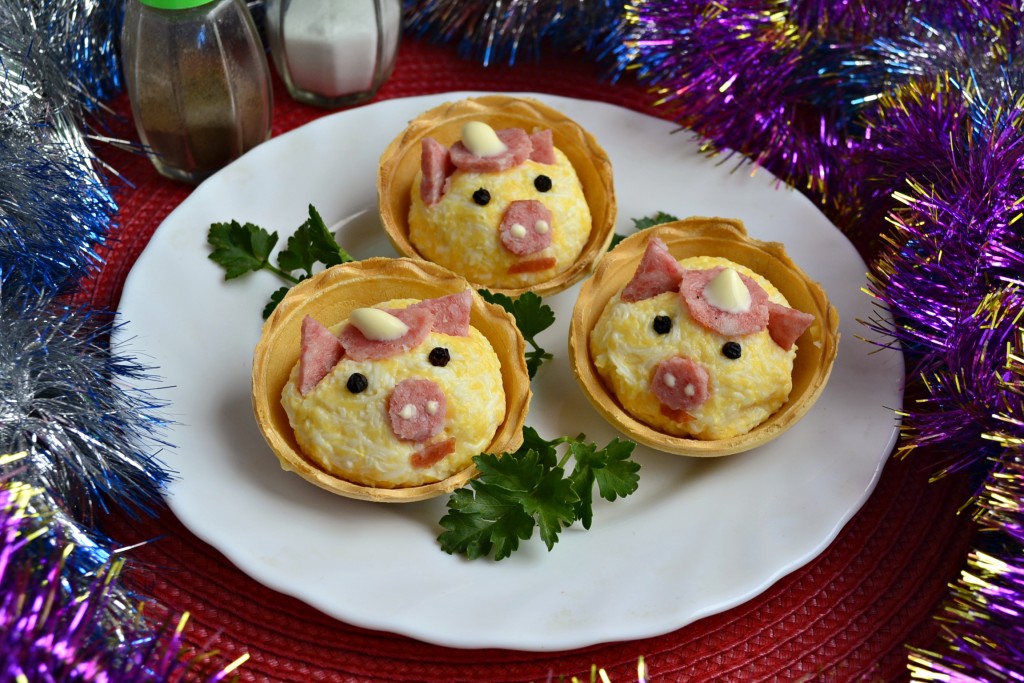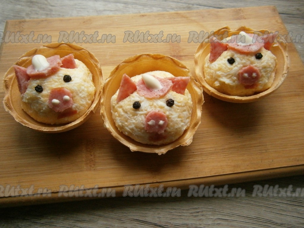 И далее оформить мордочки свинок: ушки, пятачок, ротик и шляпки вырезать из тонких ломтиков колбасы (шляпку и пятачок оформить точками из майонеза), глазки сделать из черного перца горошком.
