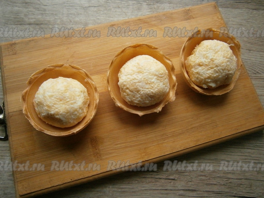 Из сырной массы влажными руками сформировать три комочка-шарика, разместить их в тарталетках.