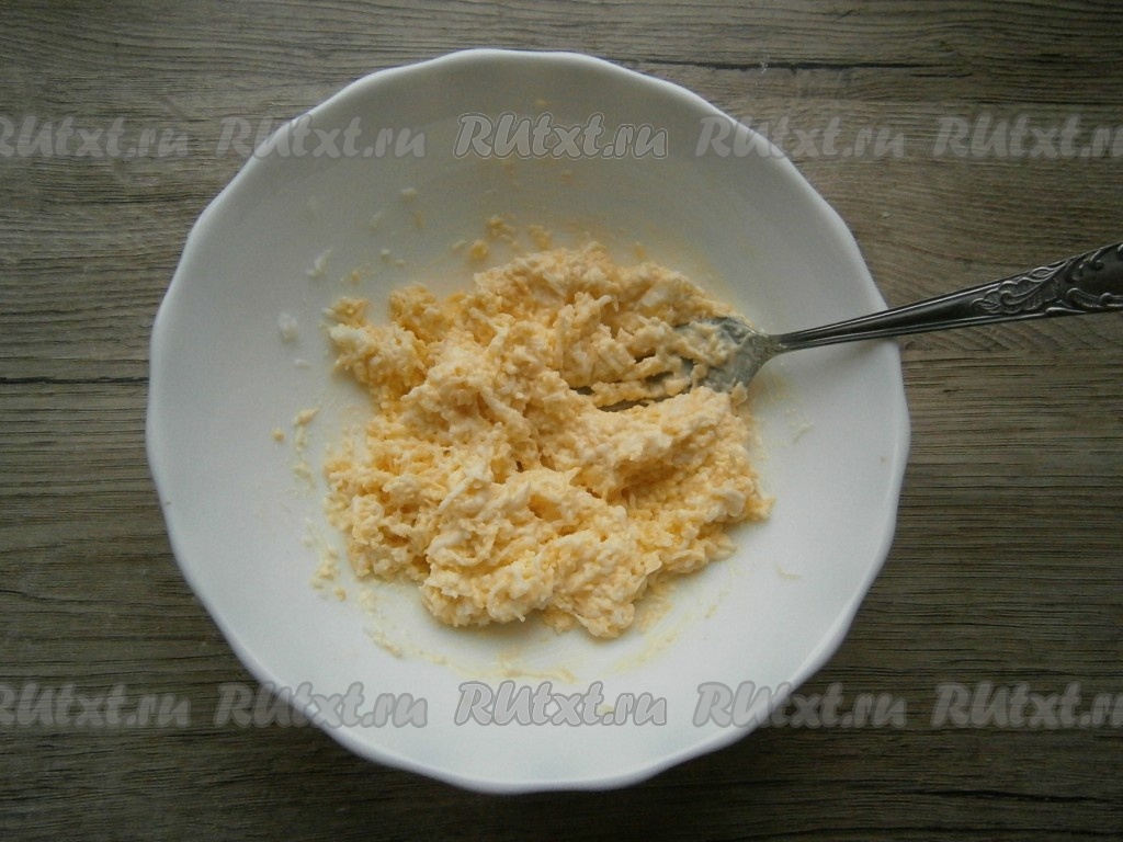 Яйца с сыром немного посолить, добавить пропущенный через пресс чеснок и майонез.