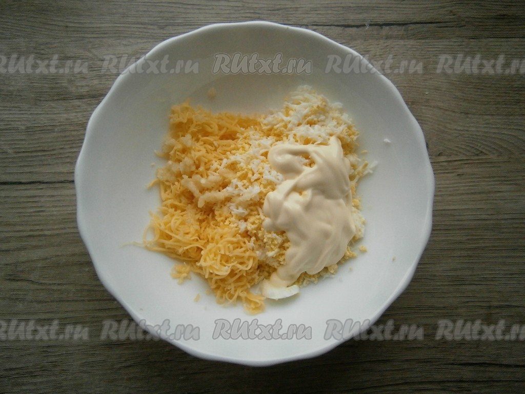 Сыр и очищенные вареные яйца натереть на мелкой терке.