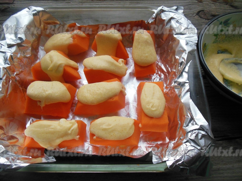 Нанесите ложкой заливку на каждый кусочек тыквы (примерно, по 1 чайной ложке).