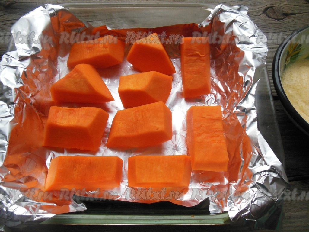 Форму для запекания застелите фольгой (или пергаментом) и выложите кусочки тыквы в один слой.