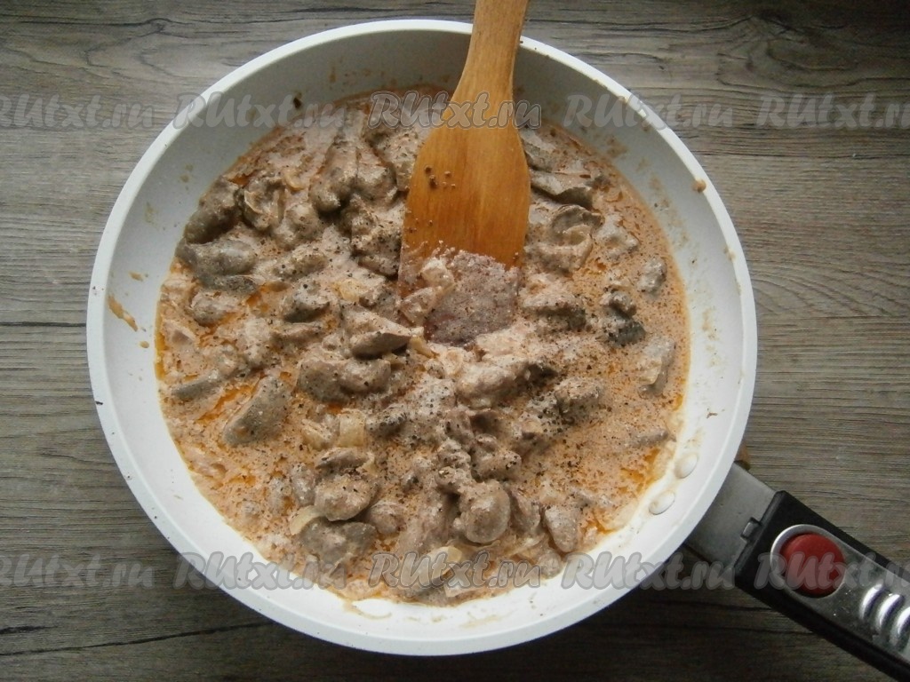 Необычайно вкусное и нежное блюдо - бефстроганов из куриной печени, приготовленный со сметаной, - подать к столу с гарниром. Конечно, это не классический бефстроганов, но, поверьте, это очень вкусное блюдо.