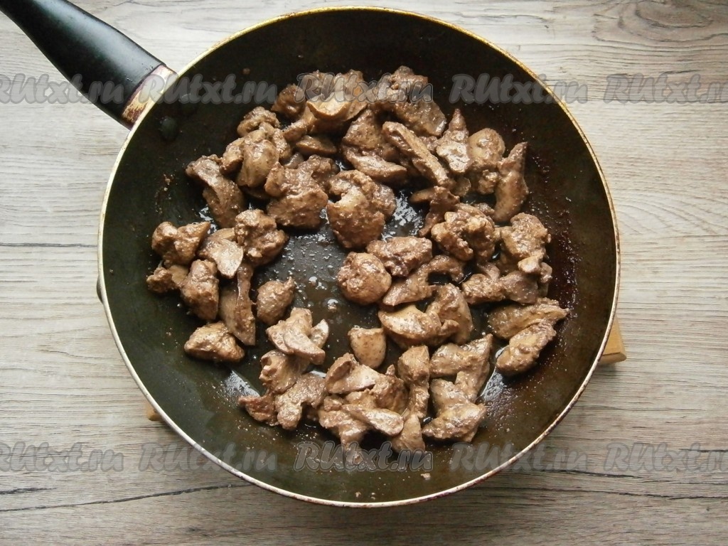 На сковороде разогреть 2 столовые ложки растительного масла, выложить кусочки куриной печени. Обжарить печенку на среднем огне, немного ее посолив, в течение 7-10 минут, помешивая. Печень должна начать зарумяниваться и быть полностью готовой (при прокалывании готовой печенки должен выделяться прозрачный сок, в нём не будет примесей крови).