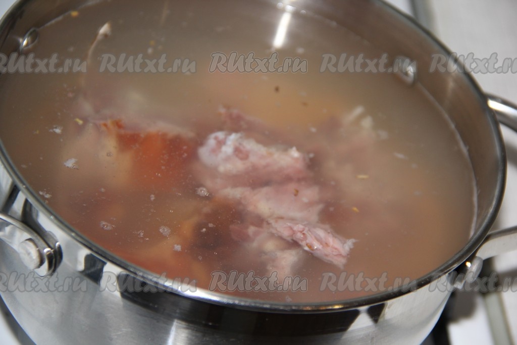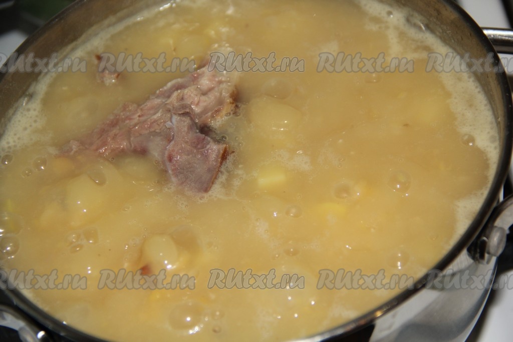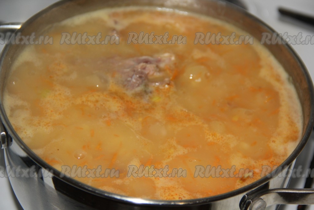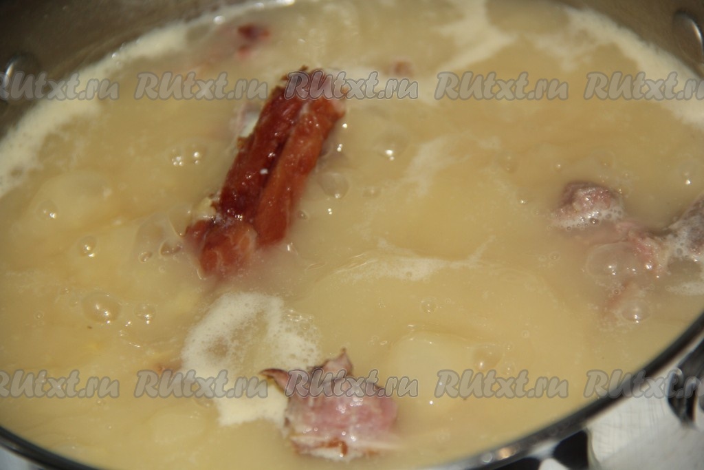 Когда вода закипит, уменьшить огонь до минимума и варить горох с копчёностями в течение минут 35.