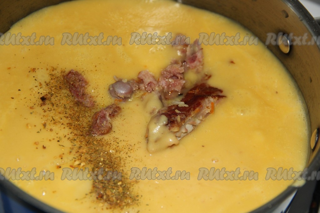 Поставить кастрюлю на огонь, добавить соль и специи по вкусу, довести суп до кипения и снять с огня.