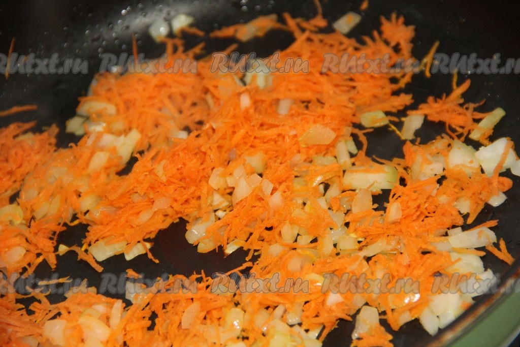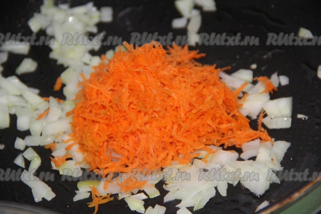 На растительном масле обжарить, помешивая, до золотистого цвета мелко нарезанный лук, затем добавить морковь, натертую на мелкой тёрке.