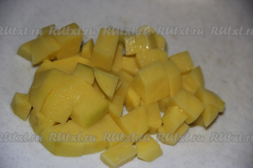 Картошку, морковку и лук очистить. Картофель нарезать на средние кубики.