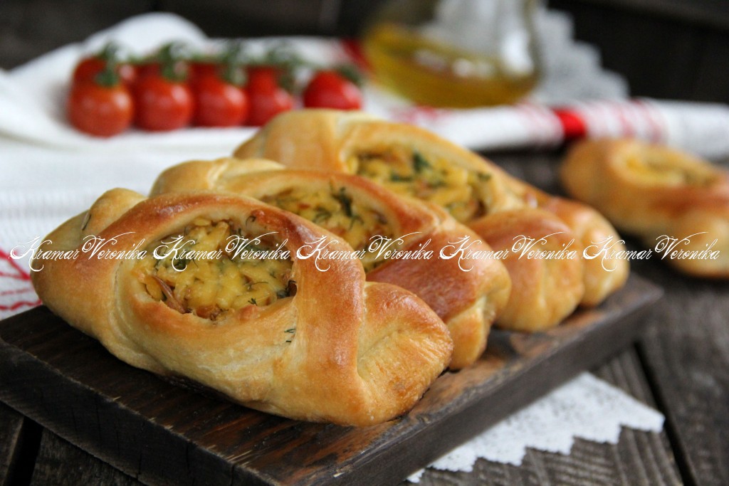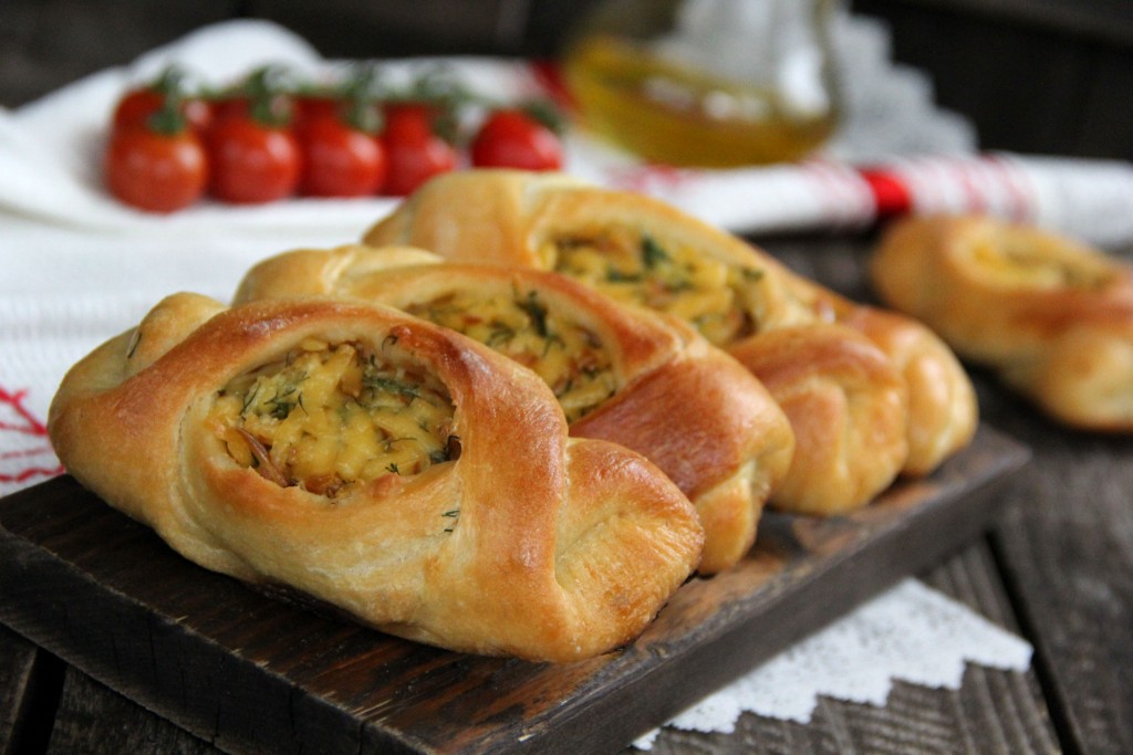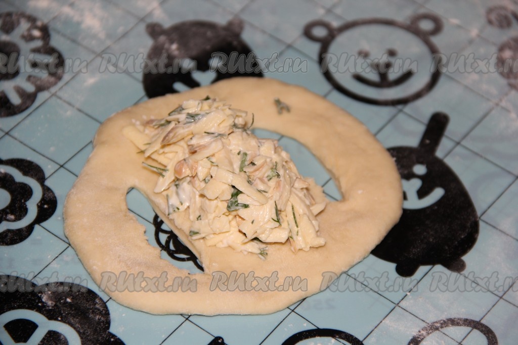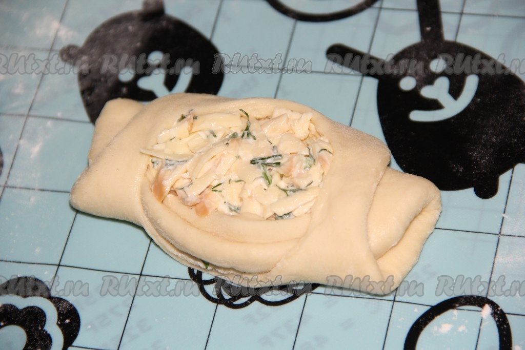 Закинуть получившиеся "крылышки" друг на друга. Получается дрожжевой пирожок с высокими бортиками и открытой сырной начинкой. Аналогично сформировать все пирожки, впрочем, можете сформировать пирожки и по-своему.