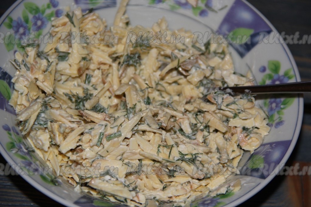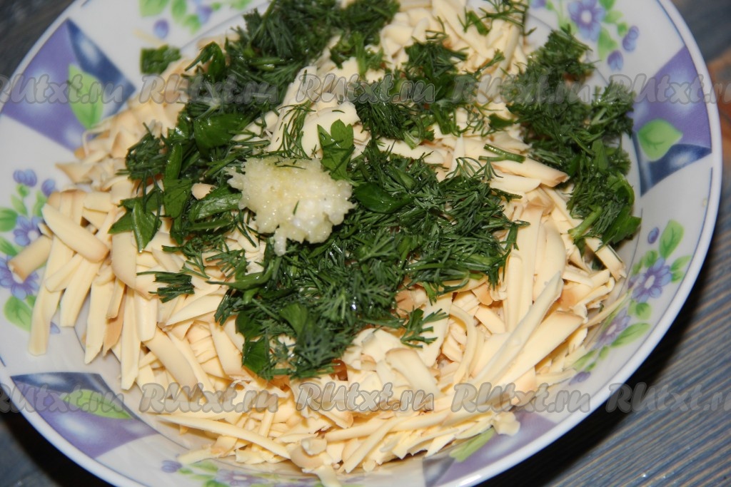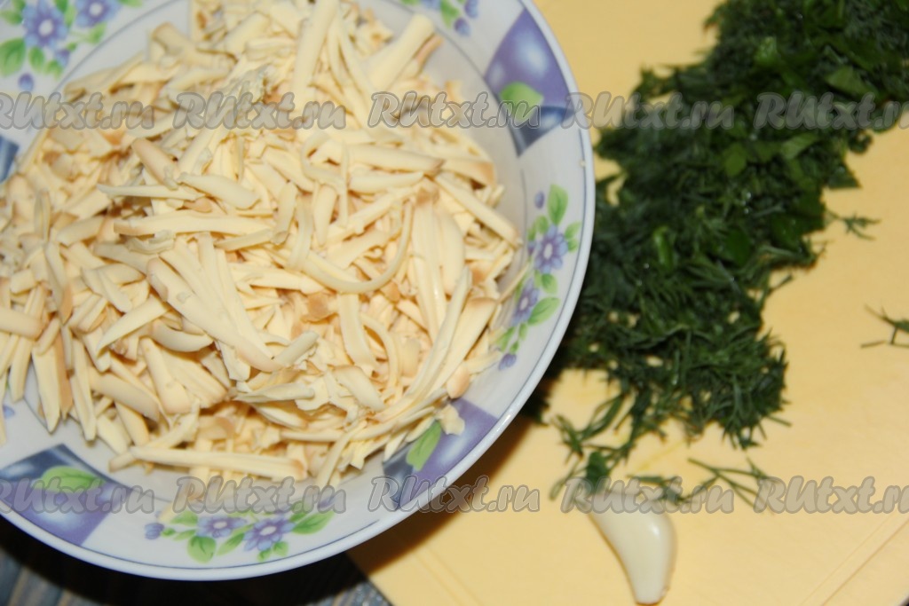 Сыр натереть на крупной тёрке. Зелень вымыть, обсушить и мелко нарезать.