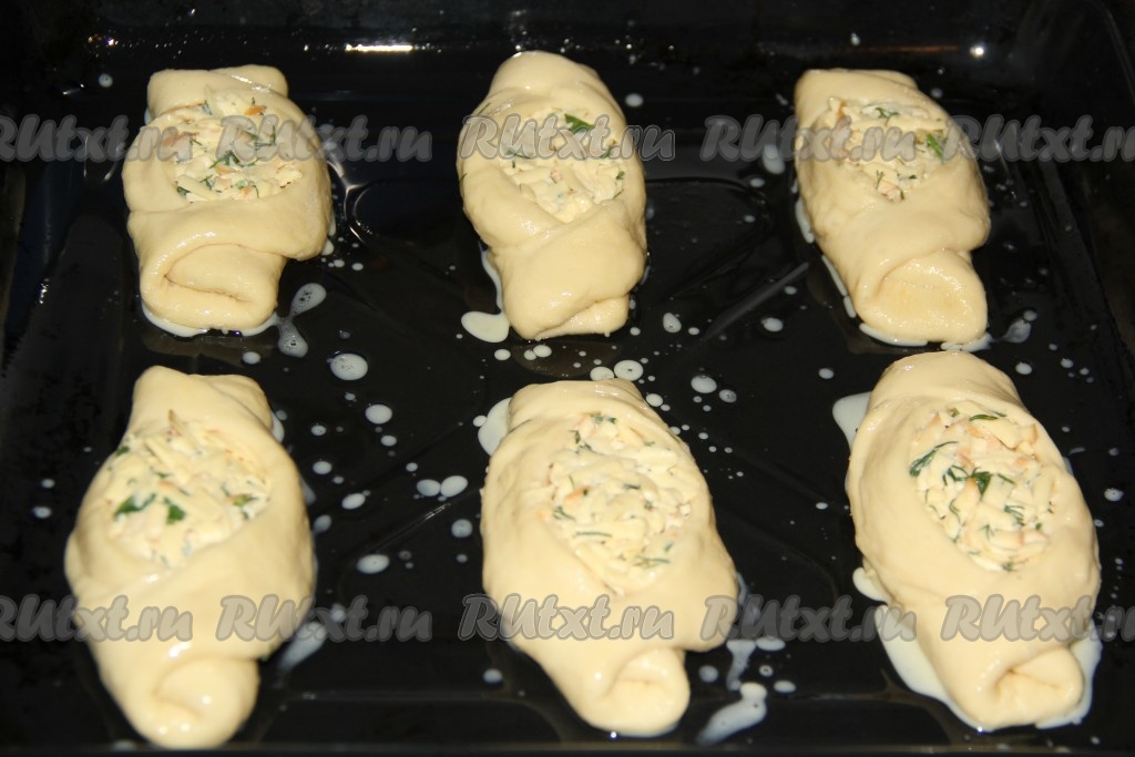 Готовые дрожжевые пирожки с сыром выложить на противень, предварительно смазанный растительным маслом. Оставить пирожки для расстойки на 30 минут.