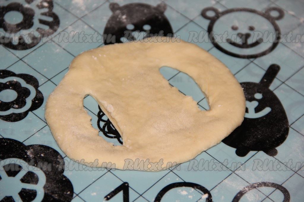 Обмять подошедшее тесто, прикрыть полотенцем и оставить на столе на 25 минут. Затем разделить тесто на равные кусочки. Каждый кусочек раскатать в круг (не тонко) на столе, припыленном мукой. На каждом кружке теста сделать два разреза по бокам (как на фото).