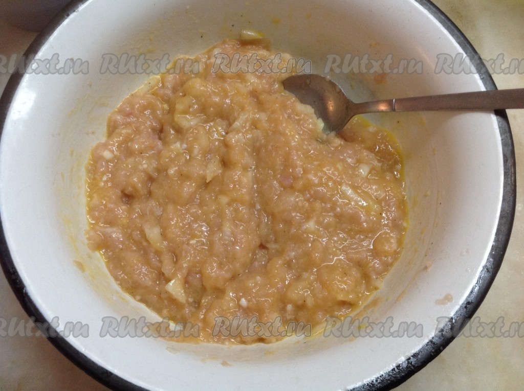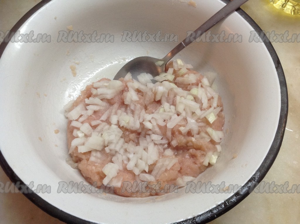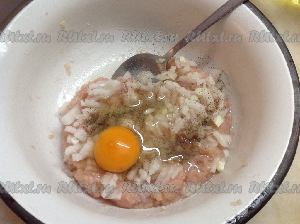 Очистить и нарезать мелко одну луковицу, добавить в куриный фарш. Затем в фарш добавить яйцо, соль, перец и хорошо перемешать.