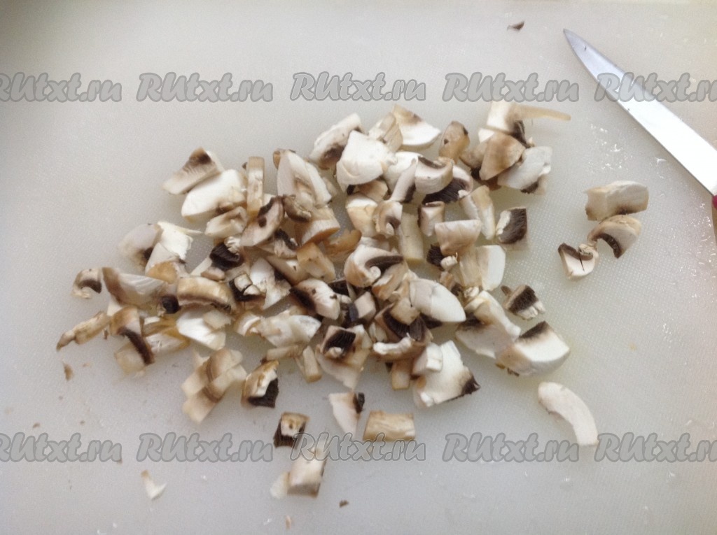 Шампиньоны вымыть, очистить и нарезать, затем отправить к луку и моркови.