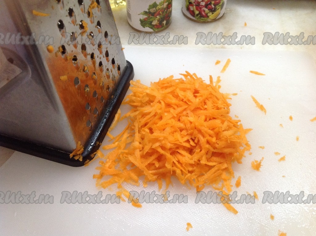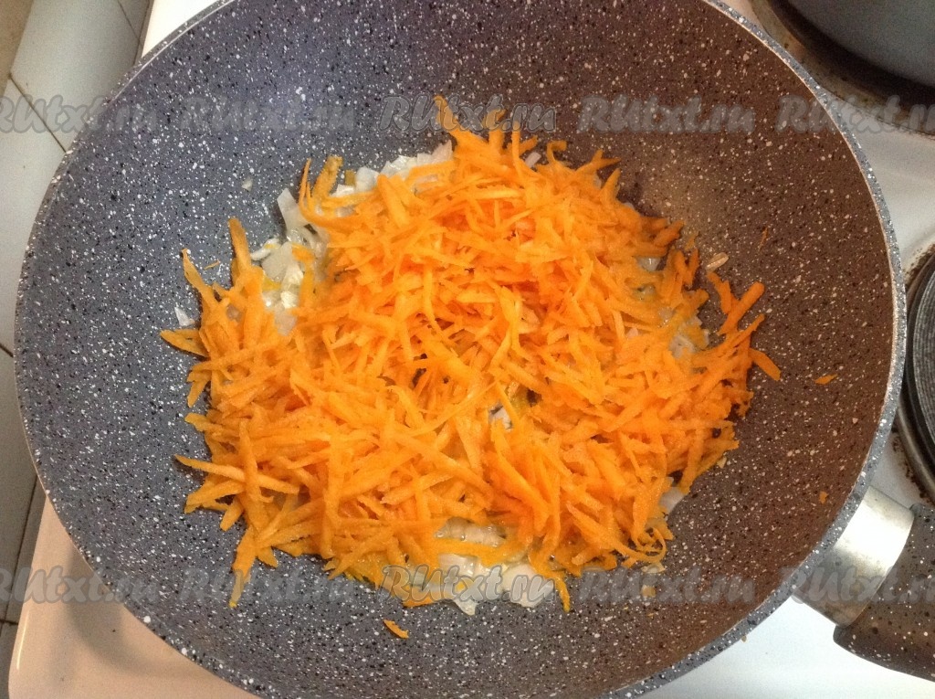 Натереть морковь и добавить на сковороду к луку, обжарить, помешивая, до мягкости моркови.