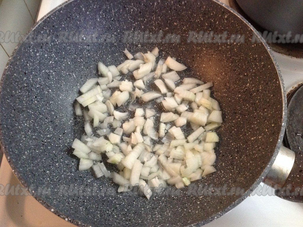 Вторую луковицу очистить, мелко нарезать и выложить на сковороду с подсолнечным маслом для обжаривания.