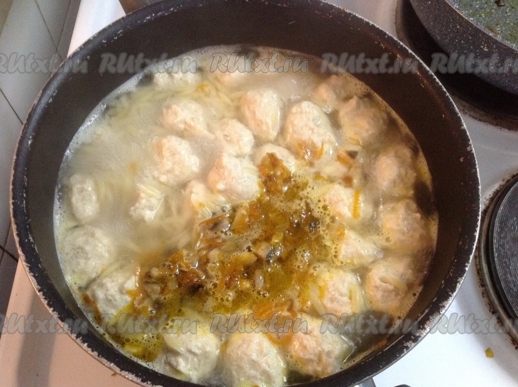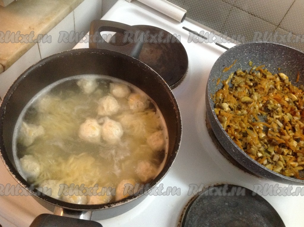 Как только вода с макарончиками закипит, лепим фрикадельки из фарша и добавляем в кастрюлю.