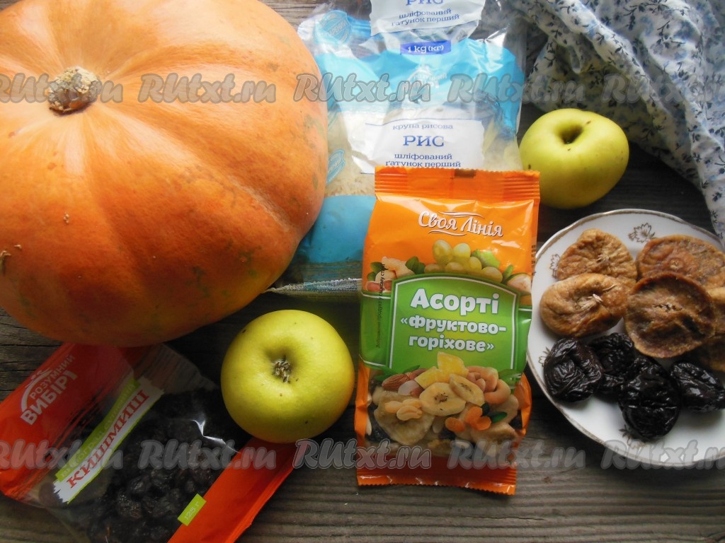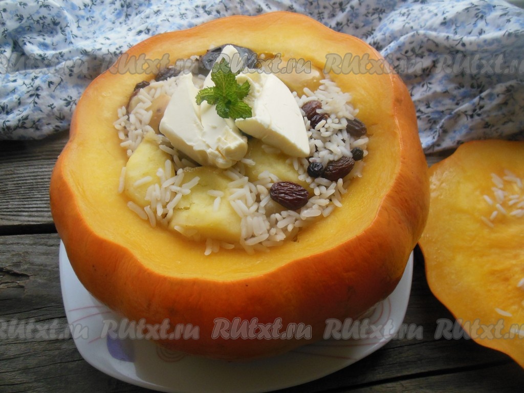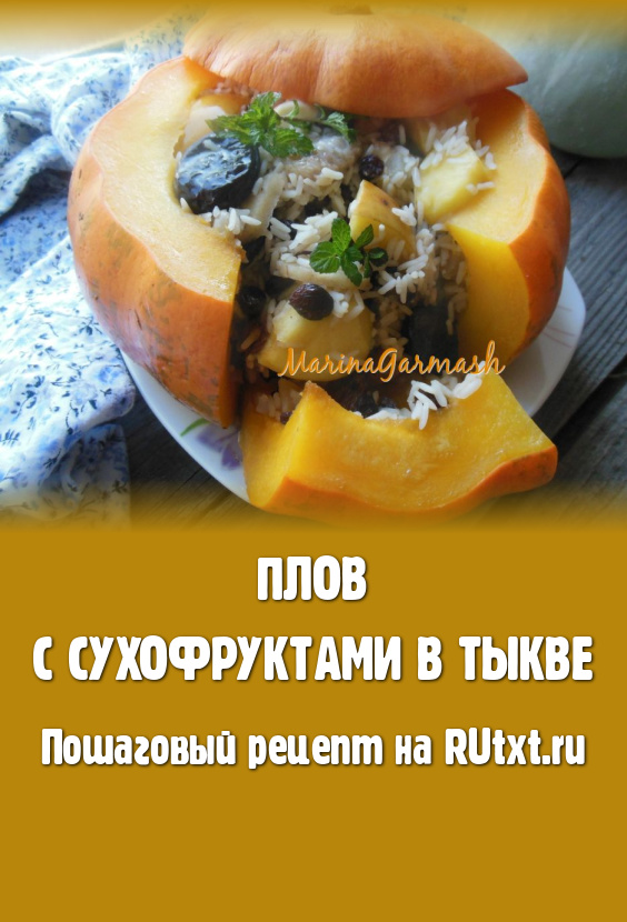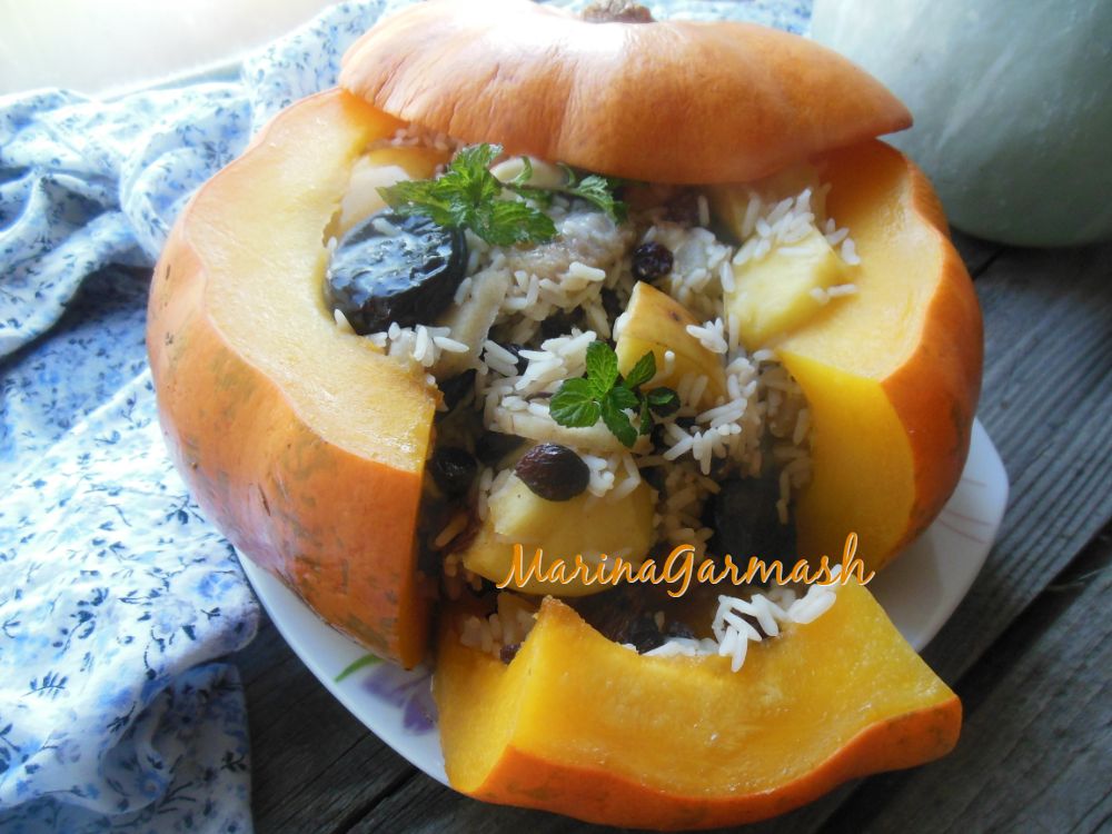 Предлагаю вашему вниманию удачный рецепт приготовления плова с сухофруктами в тыкве в духовке. Плов получается очень вкусным, ароматным, рассыпчатым. Такое блюдо станет украшением как праздничного стола, так и тёплого семейного ужина. В процессе запекания рис не подгорает, перемешивать его не нужно. Тыква служит не только посудой, но и прекрасно дополняет сладкий плов, который в ней готовится, она получается достаточно вкусной, поэтому подавать её можно вместе с рисом.