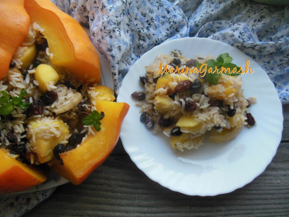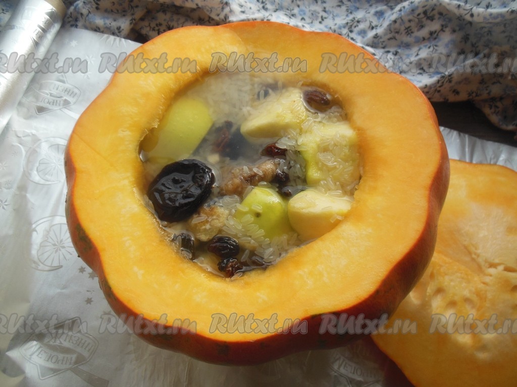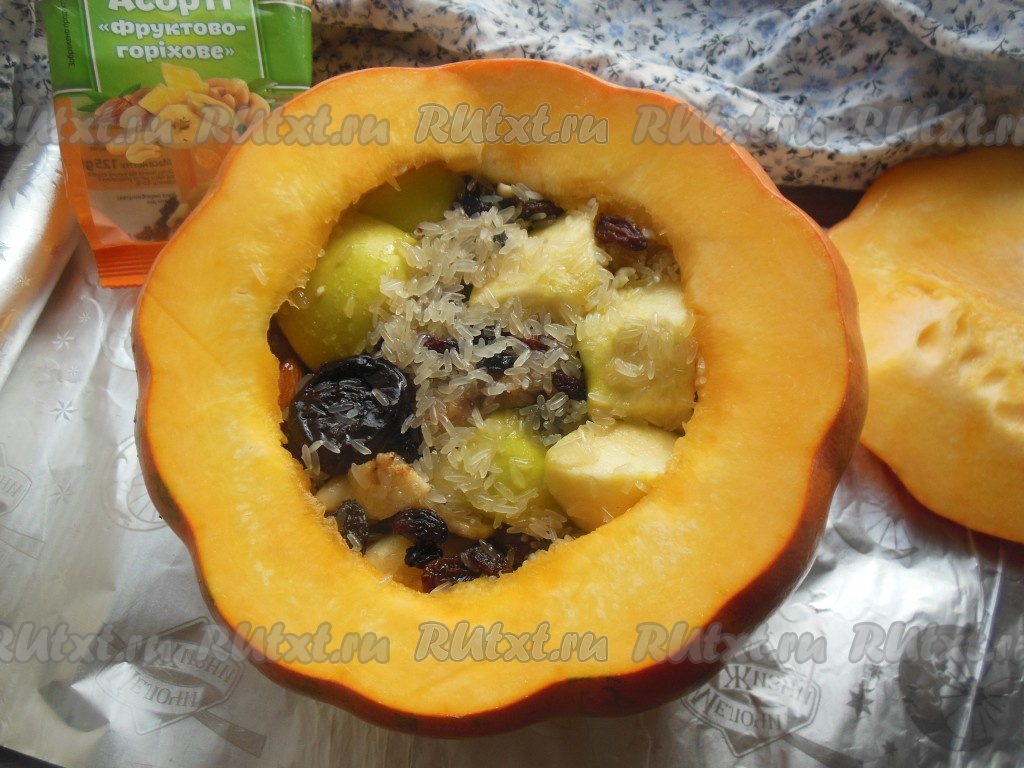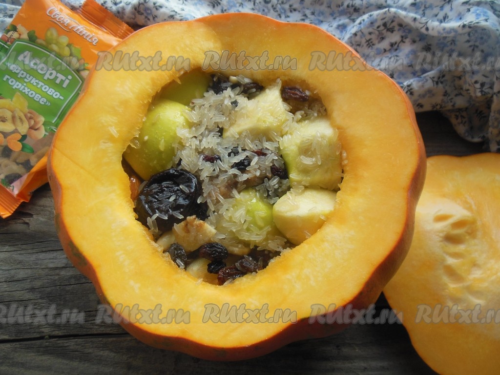 Слейте воду из тыквы. Переложите рис с сухофруктами и яблоками в тыкву.
