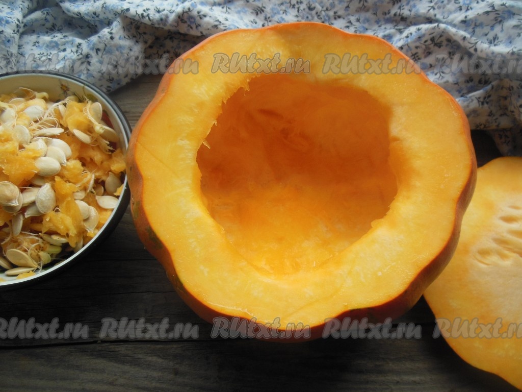 С помощью ложки удалите из тыквы сердцевину с семенами.