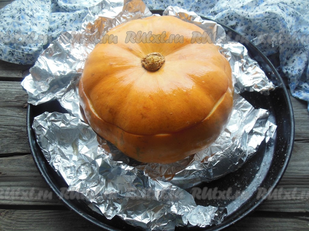 Поставьте фаршированную тыкву, завёрнутую в фольгу, в заранее разогретую до 180-200 градусов духовку. Готовьте плов с сухофруктами в тыкве в духовке 2-2,5 часа.