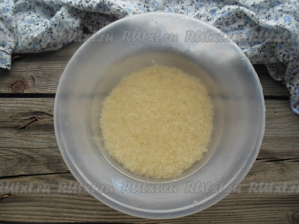 Рис выложите в сито, тщательно промойте проточной водой. Затем выложите рис в глубокую тарелку, залейте кипятком, накройте крышкой. Когда вода остынет, слейте воду.