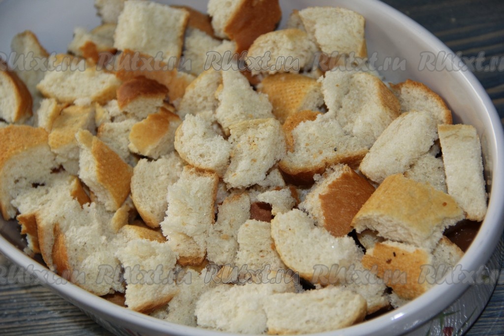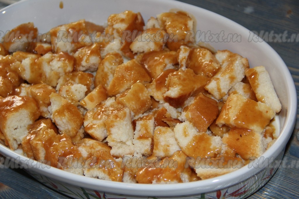 Батон разломать на крупные кусочки и выложить в форму на карамель.