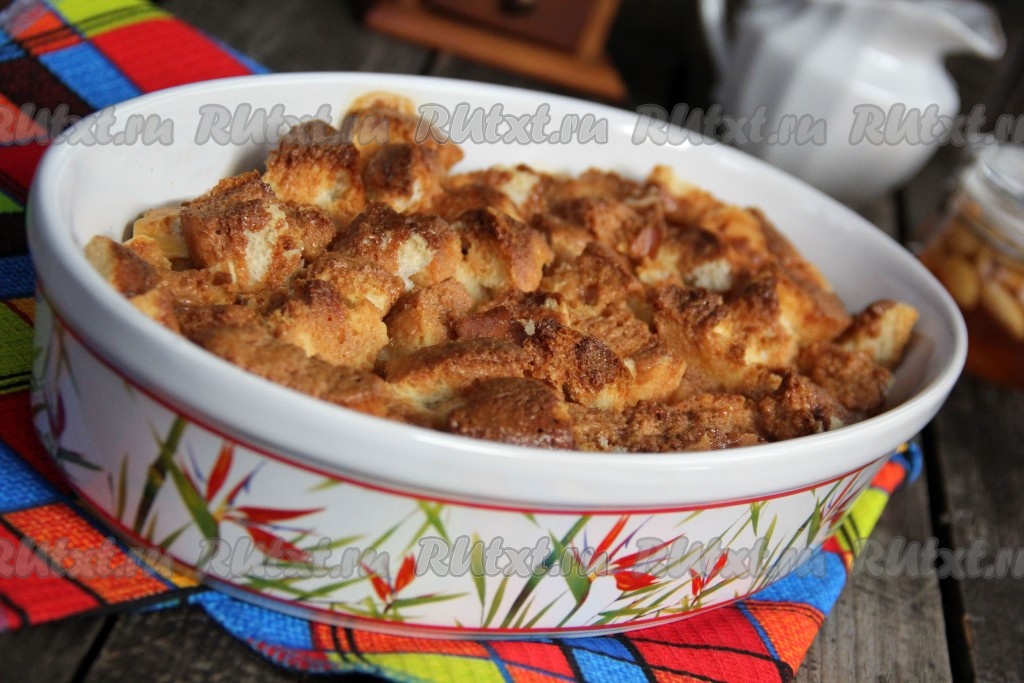 Поставить форму с хлебным пудингом в разогретую духовку и запекать при температуре 200 градусов, примерно, 45 минут. Пудинг покроется красивой золотистой корочкой.