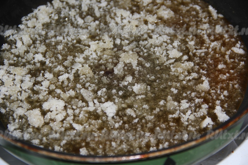 Когда сахар расплавится и станет золотисто-янтарного цвета, уменьшив огонь до минимума, небольшими порциями влить сливки комнатной температуры, постоянно перемешивая.