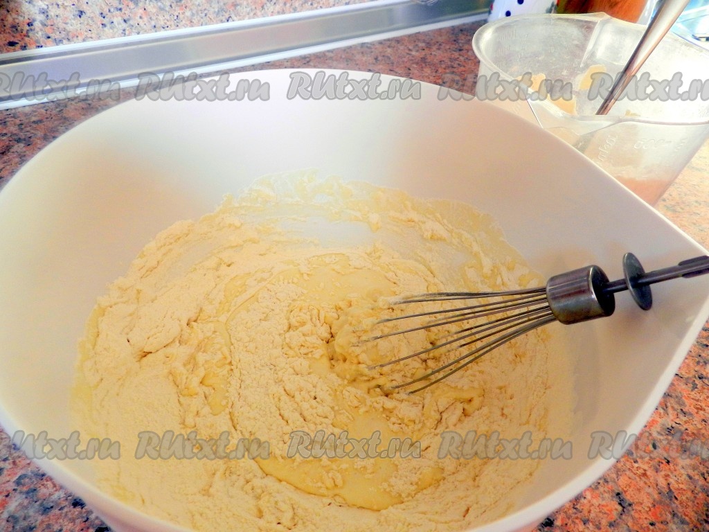Постепенно добавляя муку и полностью вмешивая венчиком, перемешивать тесто сначала в миске.