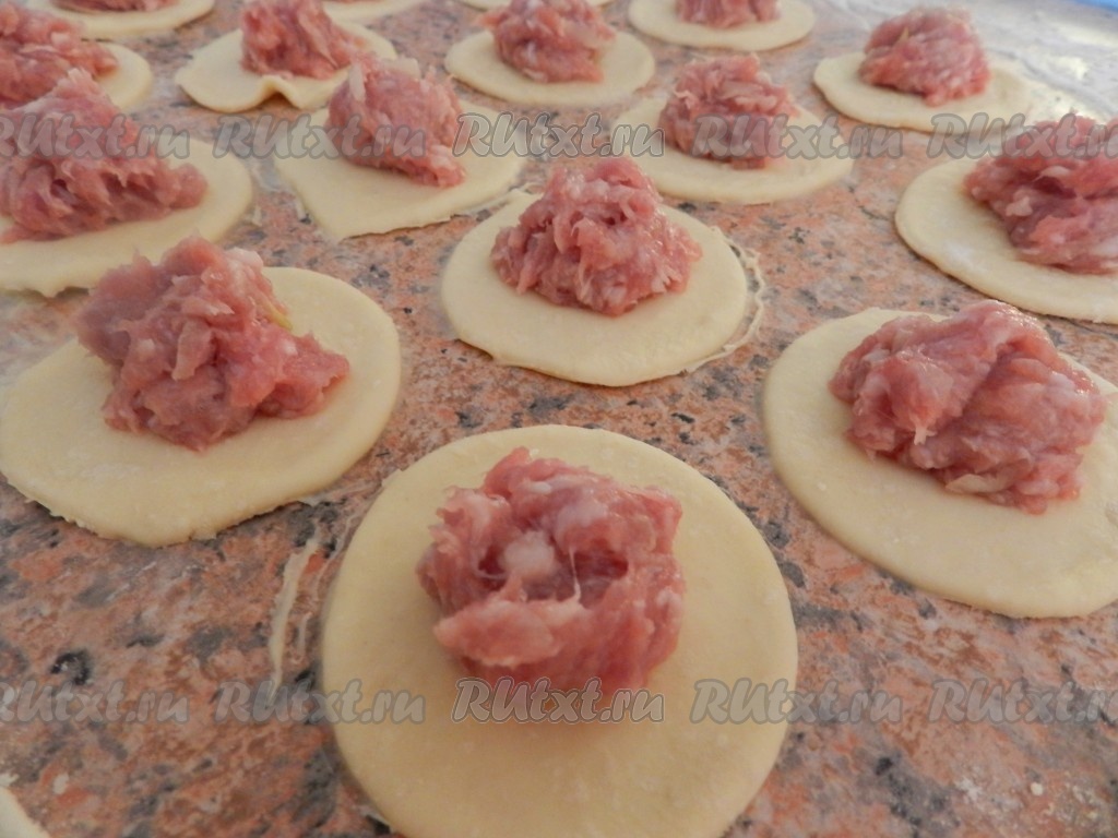 На слегка присыпанной мукой поверхности тесто раскатать в тонкий пласт, вырезать из него кружочки, в центр выложить чайную ложку фарша и слепить пельмени традиционным способом. Работать с таким тестом, замешанным на кефире и яйце, очень приятно, оно хорошо раскатывается в тонкий пласт.