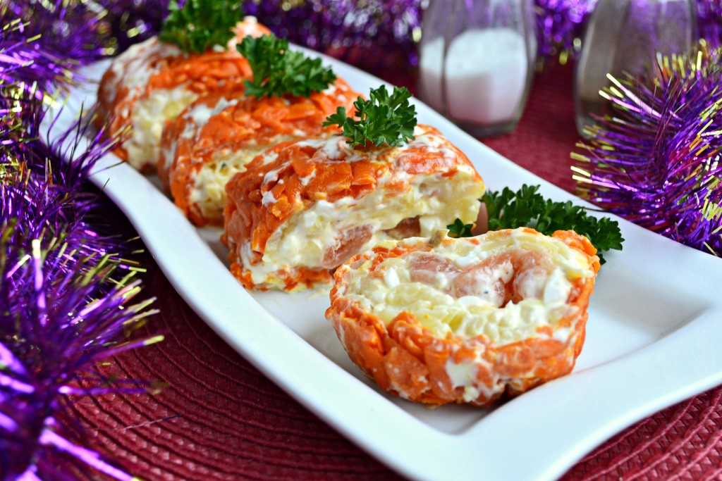 Для любого праздничного стола, а особенно - новогоднего и рождественского, предлагаю приготовить замечательный салат-закуску "Царский рулет". Это красивое и яркое блюдо понравится всем без исключения! Приготовить такую закуску не составит особого труда, да и продуктов понадобится немного, а в итоге - необычное и очень вкусное блюдо.