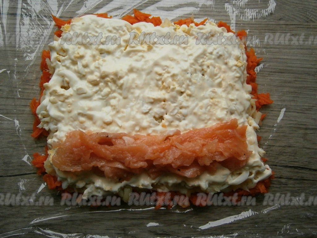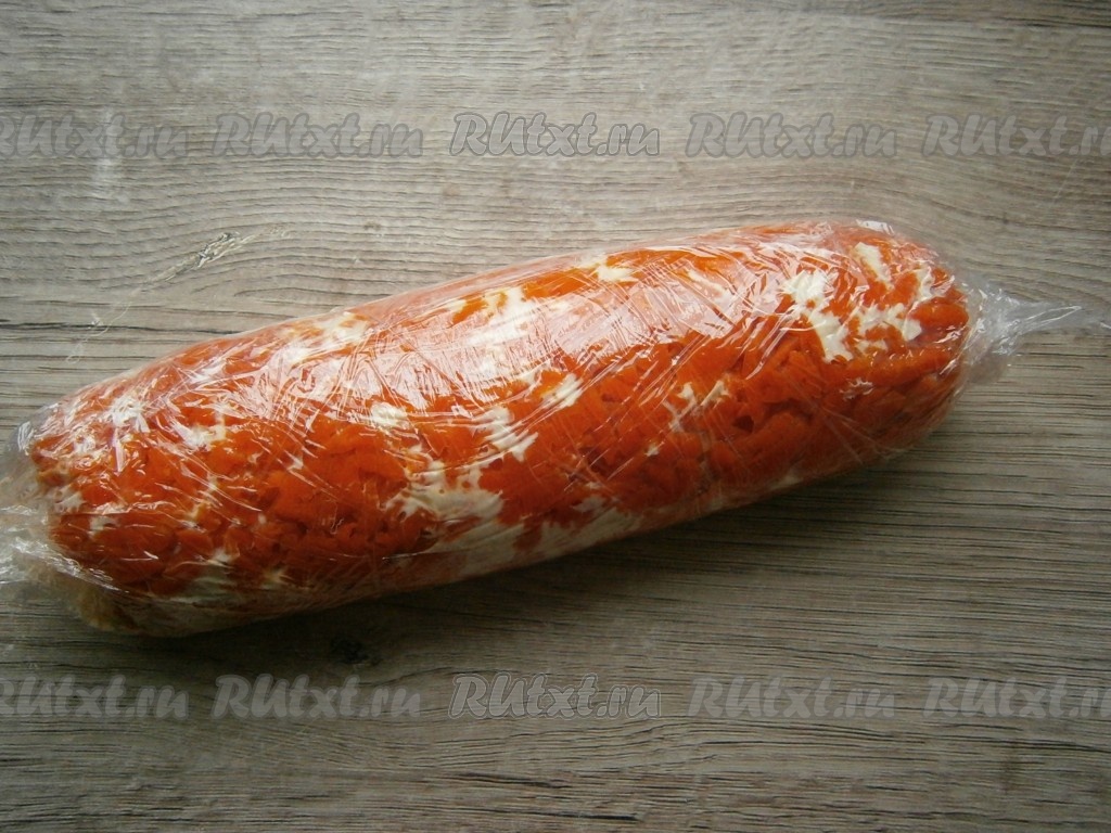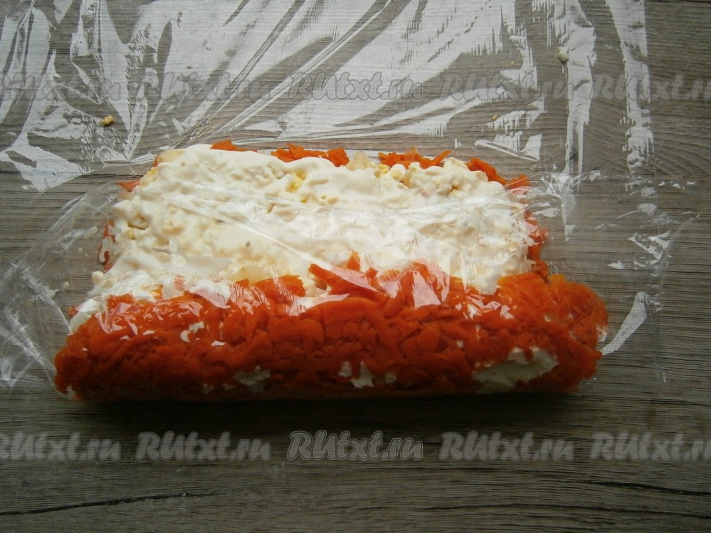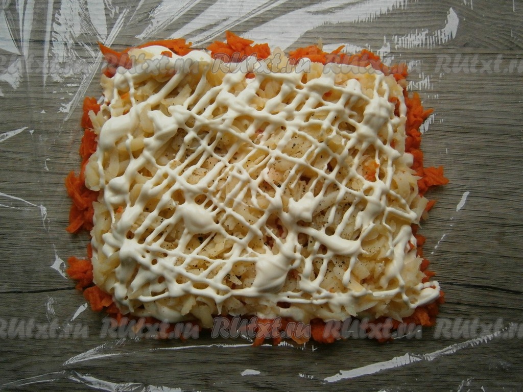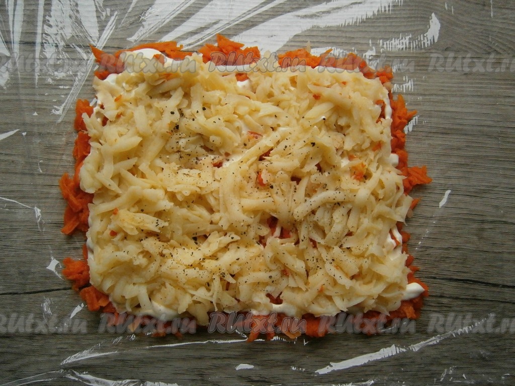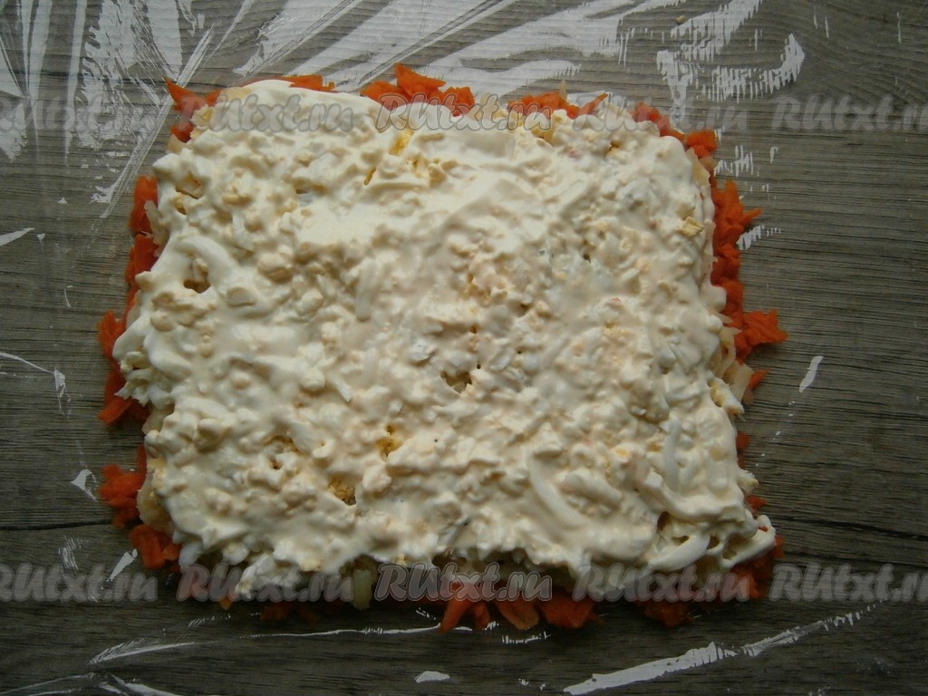 Расстелить на плоской поверхности пищевую пленку. Вареную морковь очистить и натереть на крупной, средней или мелкой терке, выложить квадратным или прямоугольным слоем на пленку, смазать майонезом.
