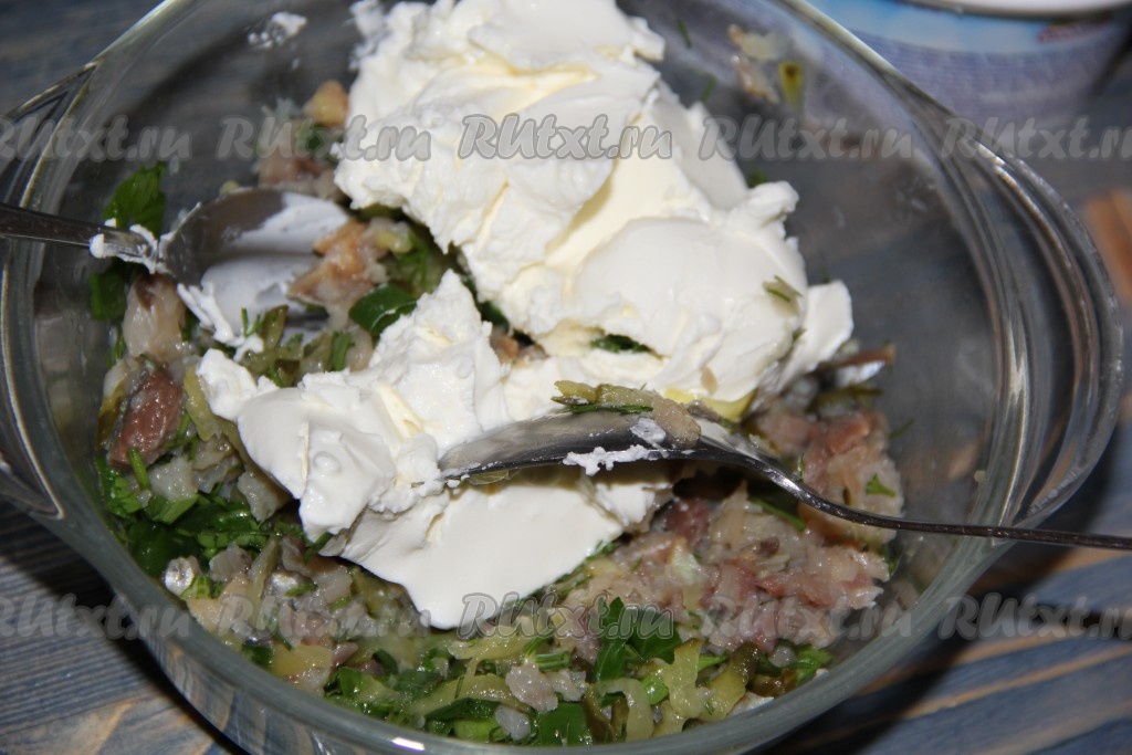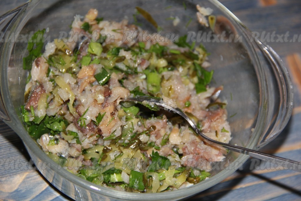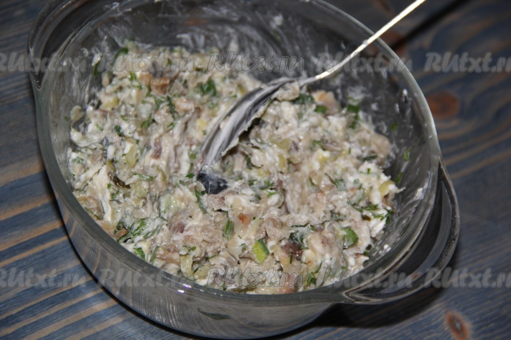 Тщательно перемешать и рыбная начинка для фарширования картошки готова.