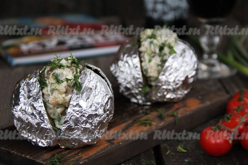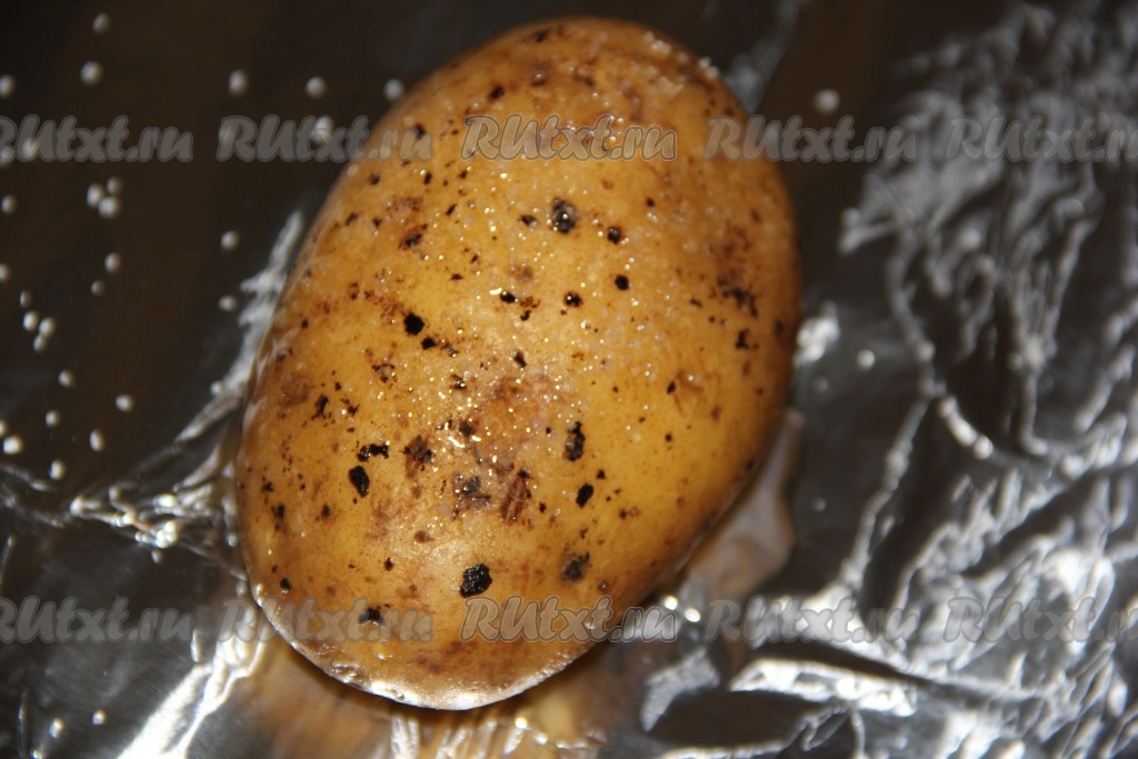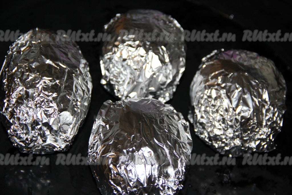 Каждую картофелину завернуть в фольгу и выложить на противень. Запекать картошку в разогретой духовке при температуре 200 градусов, примерно, 45-60 минут (продолжительность запекания зависит от размера картофеля). Готовность картошки можно проверить зубочисткой (зубочистка будет легко входить в готовый картофель).